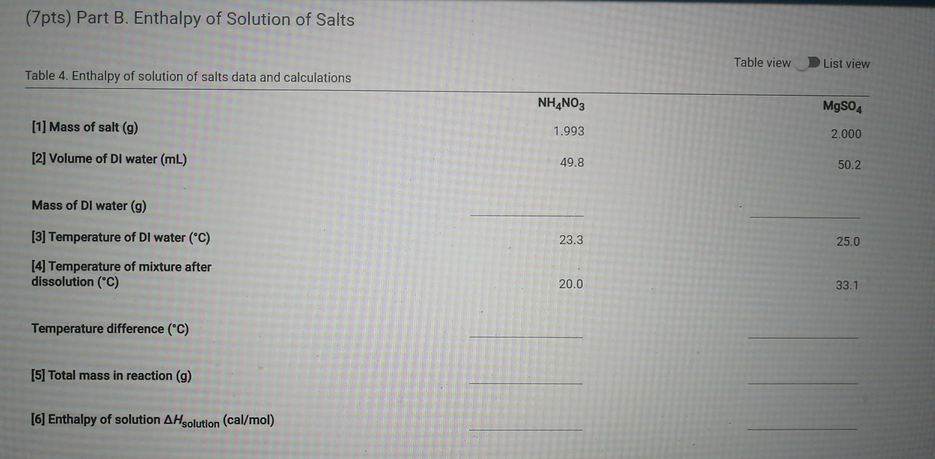 Solved Calculating Heat Of Reaction From Constant Pressure Calorimetry Student Dissolves 12 6 G Of Ammonium Chloride Nhaci In 250 G Af Water In Well Insulated Open Cup She Then Observes The Temperature Of The